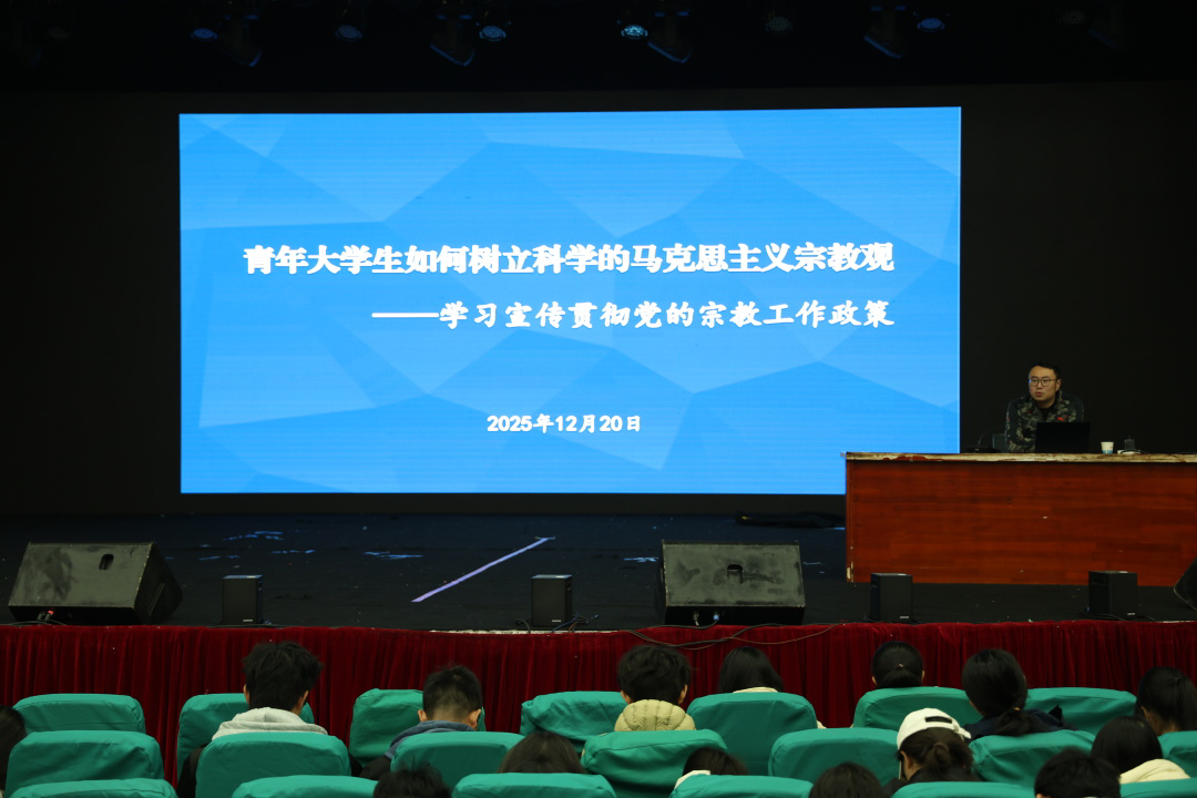 旅游学院党委副书记袁勋老师进行“党的宗教政策宣讲”专题授课,系统阐述马克思主义宗教观与我国宗教工作方针政策,引导学生树立科学的宗教观,自觉维护民族团结与社会和谐。
