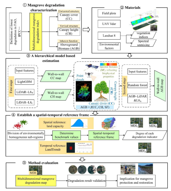 针对红树林退化过程隐蔽、传统监测手段难以捕捉垂直结构变化等难题,该研究构建了涵盖冠层覆盖度、冠层高度和地上生物量的多维度退化指标体系。团队创新性地提出了一种“前馈式”分层建模策略,有效融合了高精度无人机激光雷达(UAV-LiDAR)数据与Landsat卫星影像,反演了大尺度生态退化指标。同时,研究创新性建立了一套结合空间环境异质性与生态系统长期稳定性的“空间-时间”双重评估基准,实现了对区域红树林退化状况的精准量化与制图。